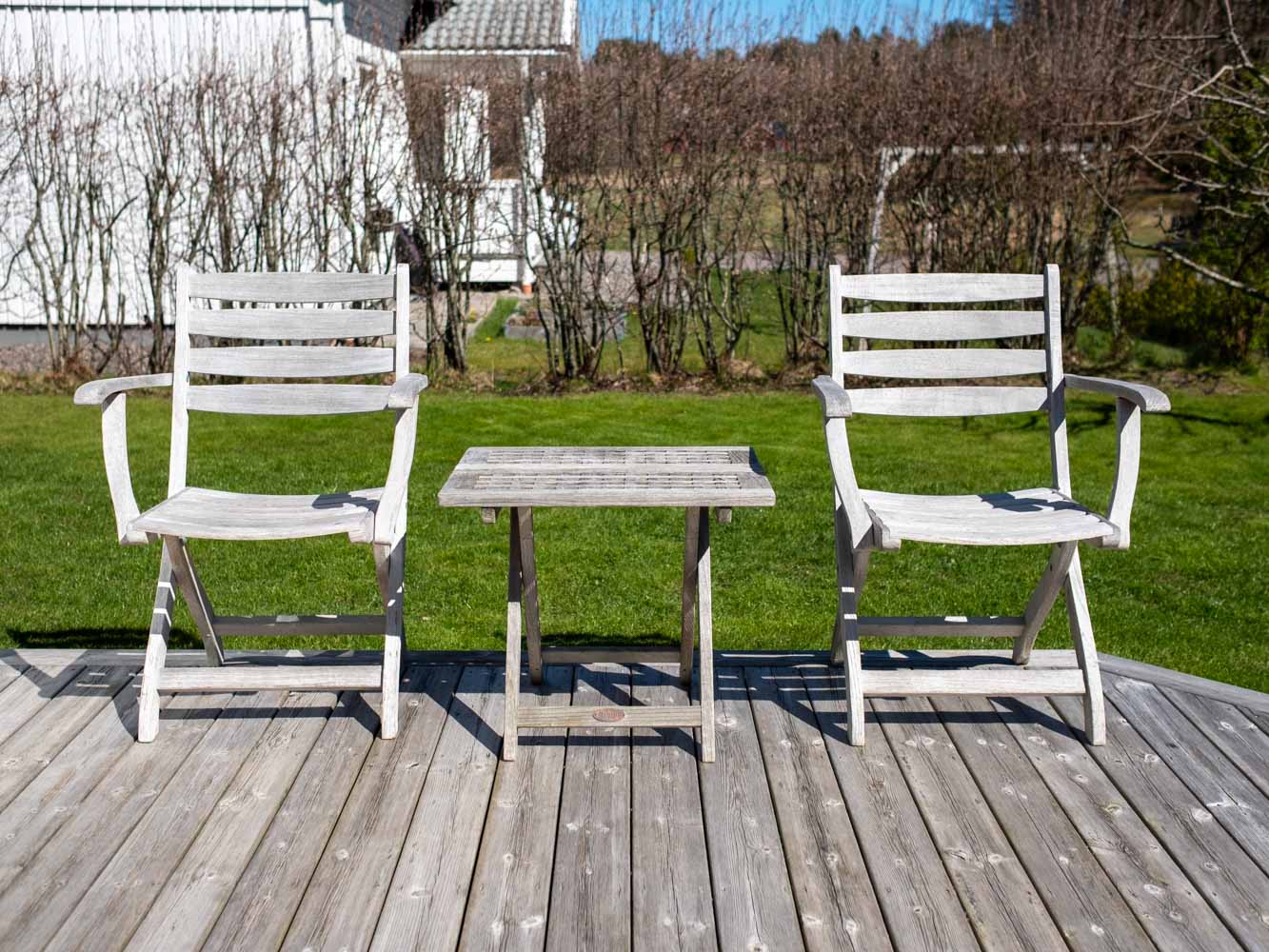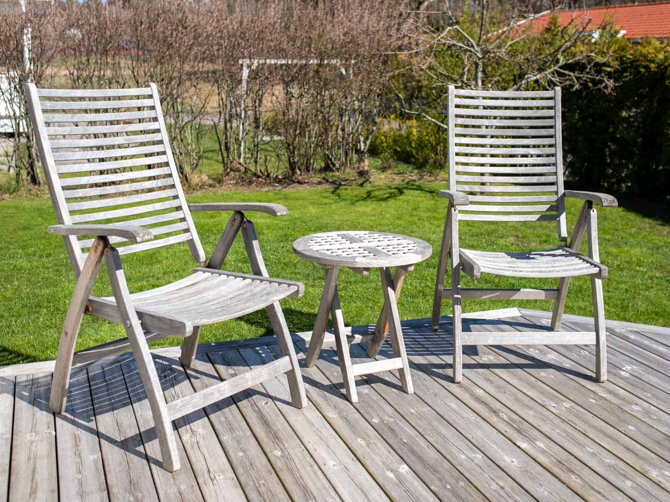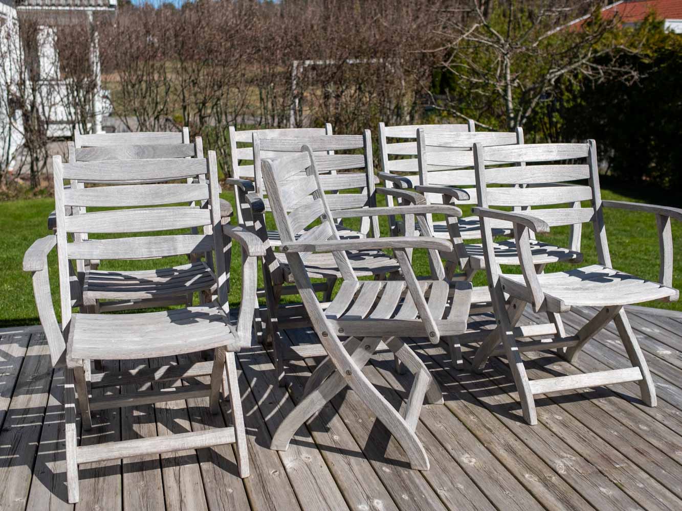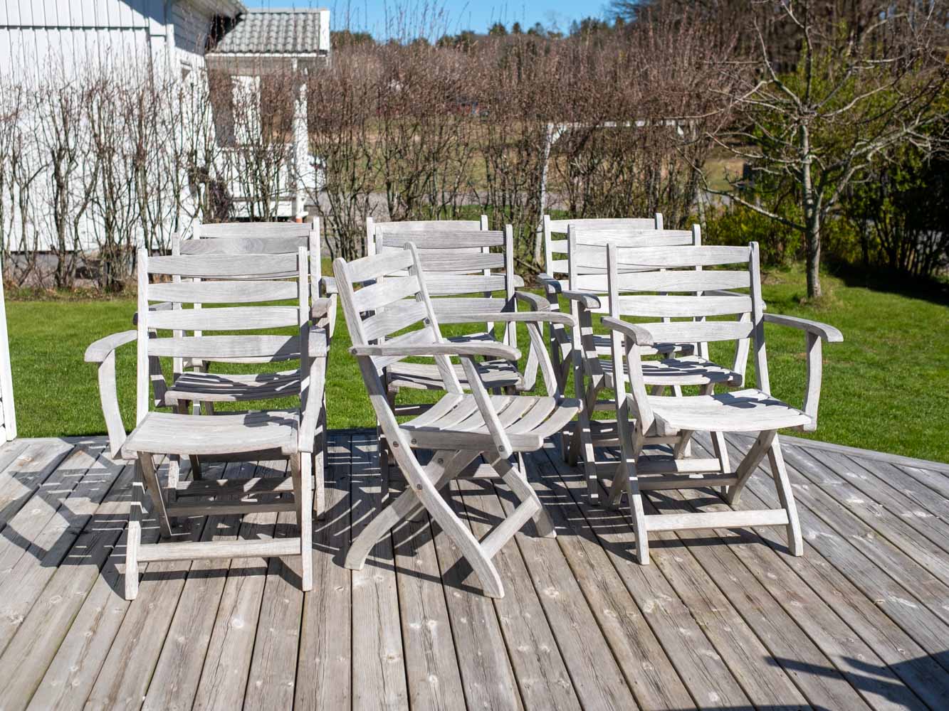Utemöbler i teak från Brafab. Positionsstolar, karmstolar, loungebord. Finns en hel del av varje sort.