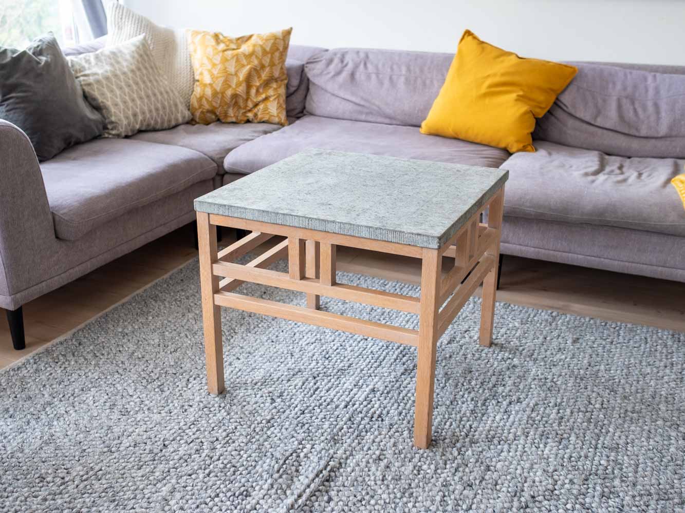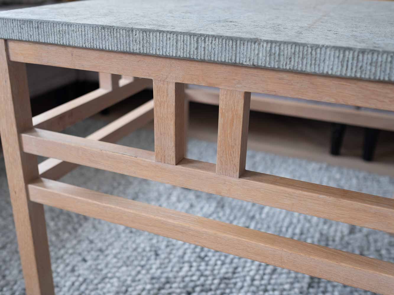 Stomme i vitoljad massiv ek. På toppen ligger kalkstensskiva från Kinnekulle.