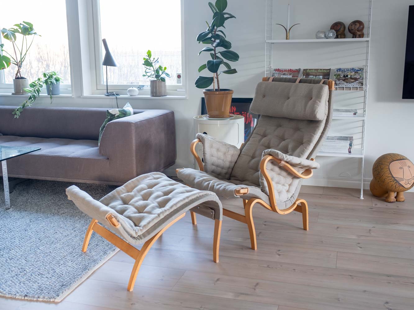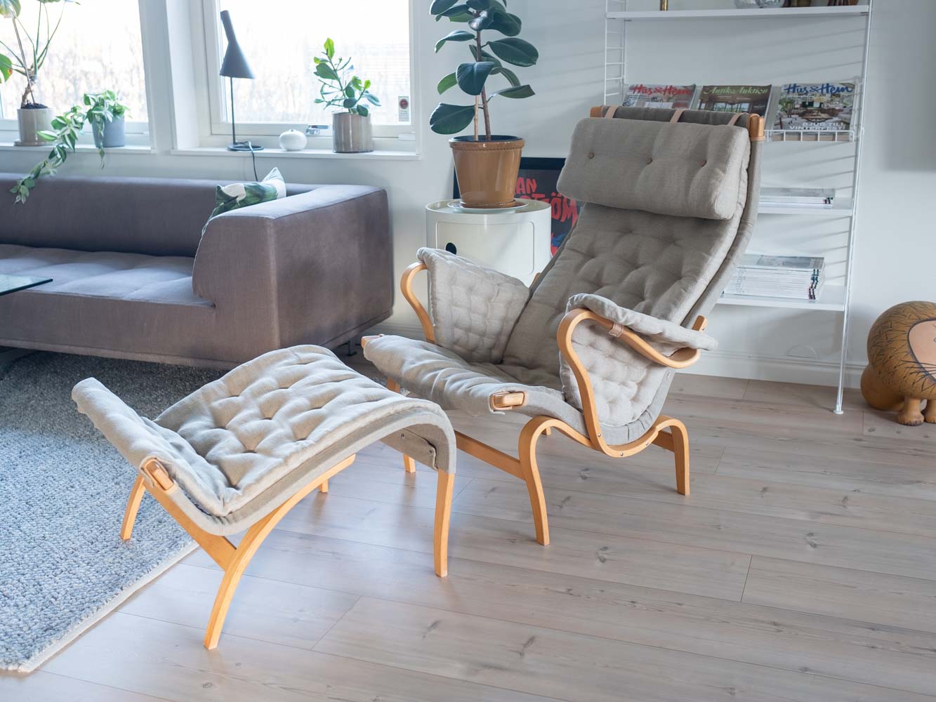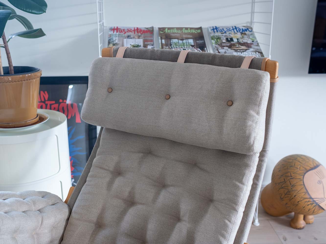Pernilla 69. Design Bruno Mathsson. Ny dynsats på både fåtölj och fotpall i Flax 21. Även ny bärande väv.